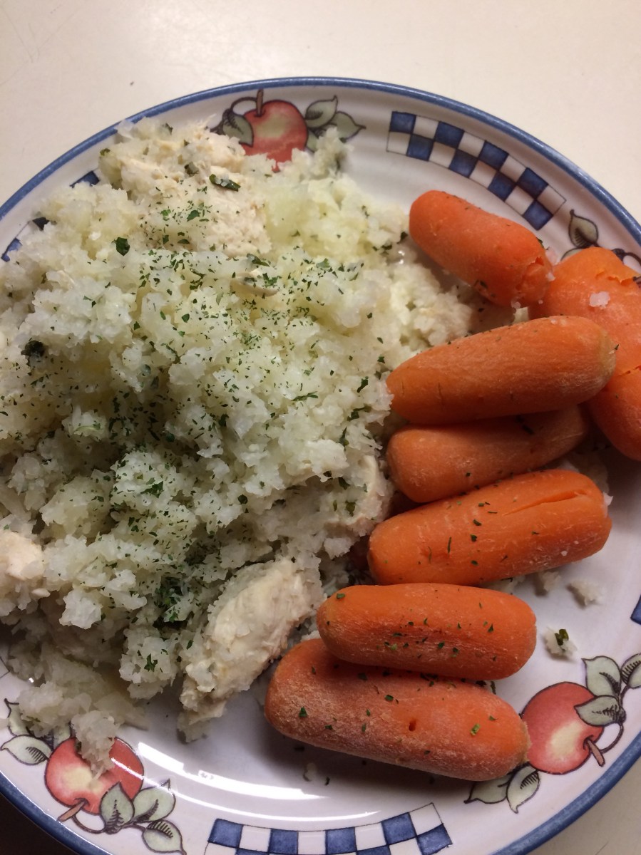 In a sauté pan on medium heat, cut up chicken fillet into cubes and cook. When chicken is half way cooked add riced cauliflower flower to chicken and stir often to keep from over cooking or making cauliflower mushy.