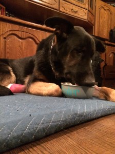 My guilty pleasure is when mommy brings a bowl of soft food. Oh, that is my favorite time of the day. She is even letting me eat when I don’t normally, like every couple of hours. A dog could get use to this kind of spoiling, but I am a tough boy, I will be back up and at it with my ball soon (ssshhh, don’t tell him, but the vet wants him to lay low for 7 days). We will take it one day at a time. And today is one where it is one hour at a time.